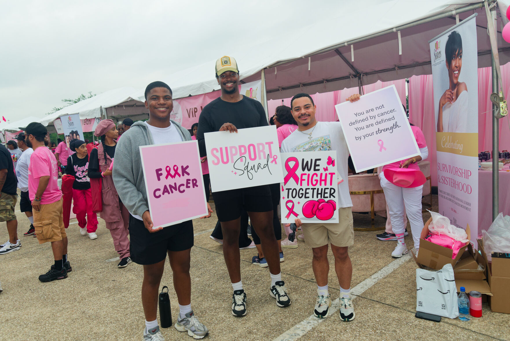 Black Girl Vitamins was on site sharing health resources. Amber Cares, Mostyn Law, and 1-800-Truck Wreck sponsored coffee, donuts, kolaches, and chair massages for every attendee. Children ran through the park in pink shirts. Elders moved at their own pace. Teams in matching colors carried signs bearing the names of women they had come to honor—women who had survived, and women who had not.